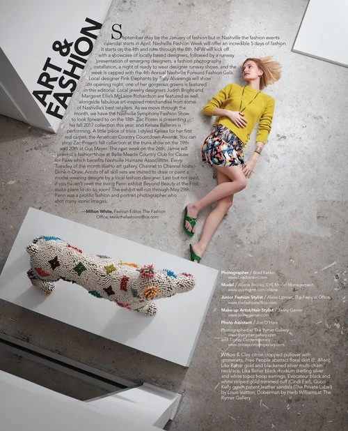 Working with Nashville Arts Magazine allowed us to blend many different aspects of photography into one shoot. Working with Fashion Editor Milton White, Junior Fashion Stylist Alexa Lipman, Makeup Artist and Hair Stylist Jenny Garner, and Model Aliene Brooks, one of the goals was to highlight clothing that reinforced the artwork backdrop.